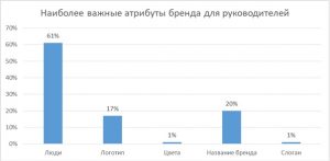 Более чем для половины опрошенных руководителей (61%) наиболее важный атрибут бренда — люди, поскольку имидж компании формируется именно через людей, работающих в ней. Однако для значительной части респондентов большую роль также играют название бренда (20%) и логотип (17%). Менее важные атрибуты — слоган (1%) и цвета (1%).